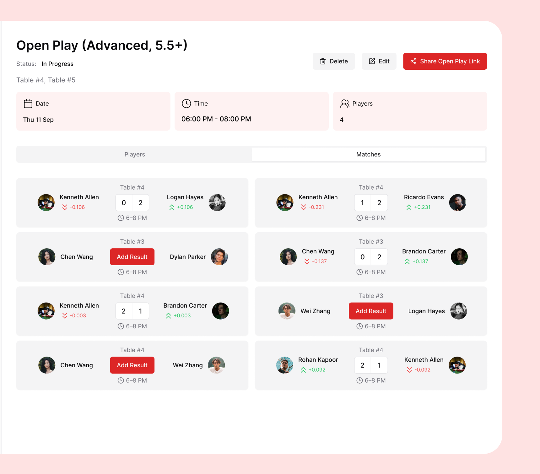 CuePal lets you host structured open plays that attract players of all levels. Set formats, manage rotations, track results automatically, and keep your club buzzing. Increase participation, build community, and maximize table usage.