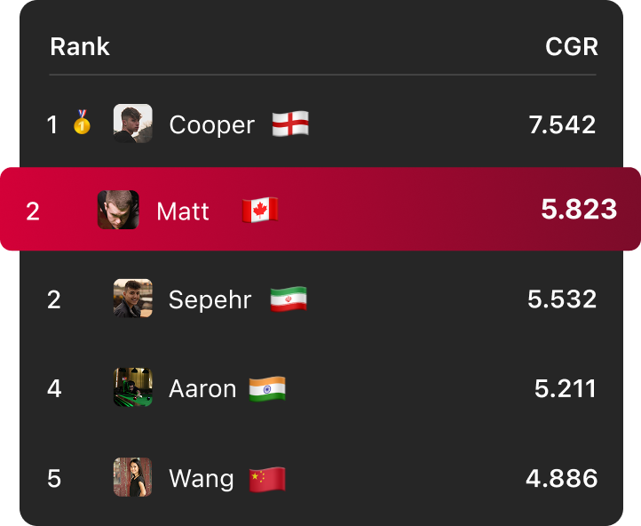 Log every result in seconds, whether it’s a friendly knock, a club league, or a big tournament. CuePal updates your CGR automatically, keeping your global ranking accurate and up to date.