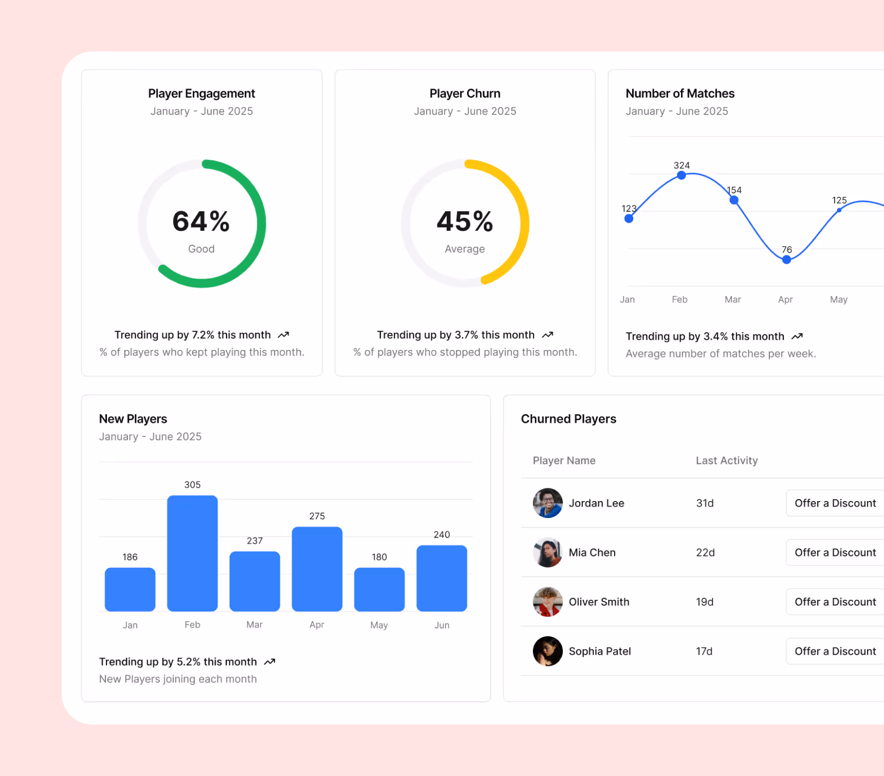 深入了解俱乐部的表现。衡量玩家的参与度、留存率和流失率,以数据为依据做出推动增长的决策。
